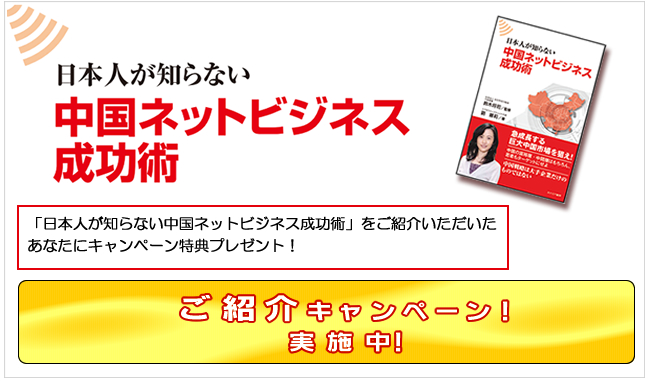 中国女性ITコンサルタント劉娜莉さん著『日本人が知らない中国ネットビジネス成功術』業界で著名なあの鈴木将司先生監修で出版。特典も魅力的です。期間限定アマゾンキャンペーン始まります。→http://exe-china.com/book/campaign/